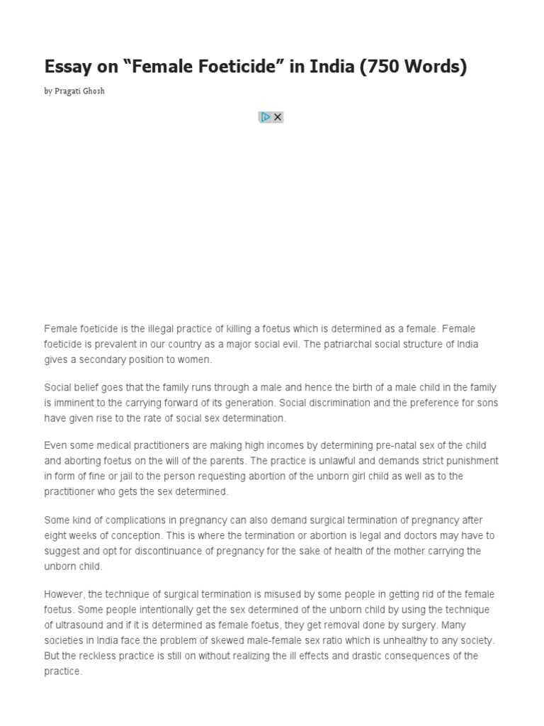 In the absence of adequate contraceptive measures, female foeticide essay, the women are mostly forced to choose the path of abortion in case they conceive another female child, female foeticide essay. Female foeticide is no doubt a cruel practice, female foeticide essay, is perhaps most widely practised as a crime in India. It is estimated that over one million female fetuses have been selectively killed in India, making it a country with one of the worst skewed sex ratio.