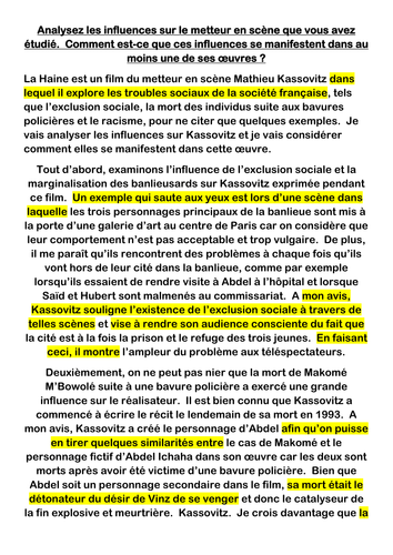 · La Haine was to some extent based on an actual event: the death of an year-old black youth shot dead during interrogation by police in But the riots and the violent confrontation between the police and young people is placed within a Estimated Reading Time: 9 mins · La Haine Model Essays (2) AS and A2 French- lot1 La Haine- Essay questions. In this Bundle: 10 model essays with their model answer and model plan + a writing essay practice. Questions are: Lot1: Expliquez l’intrigue dans La Haine et la position des personnages principaux par rapport à l’intrigue-Eprouvez-vous de la compassion pour Vinz? Lot2: 'Le titre du film La Haine 5/5(12) French - La Haine Essay Plans. STUDY. Flashcards. Learn. Write. Spell. Test. PLAY. Match. Gravity. Created by. lcairns3. Key Concepts: Terms in this set (38) Chef d'oeuvre. LOA: Definition of 'work of art' and importance of La Haine to French culture. 1. Social impact (Alain Juppe, diverse cast) 2. Production/storyline (auteur, trois unites) 3. Casting (same names, unknown